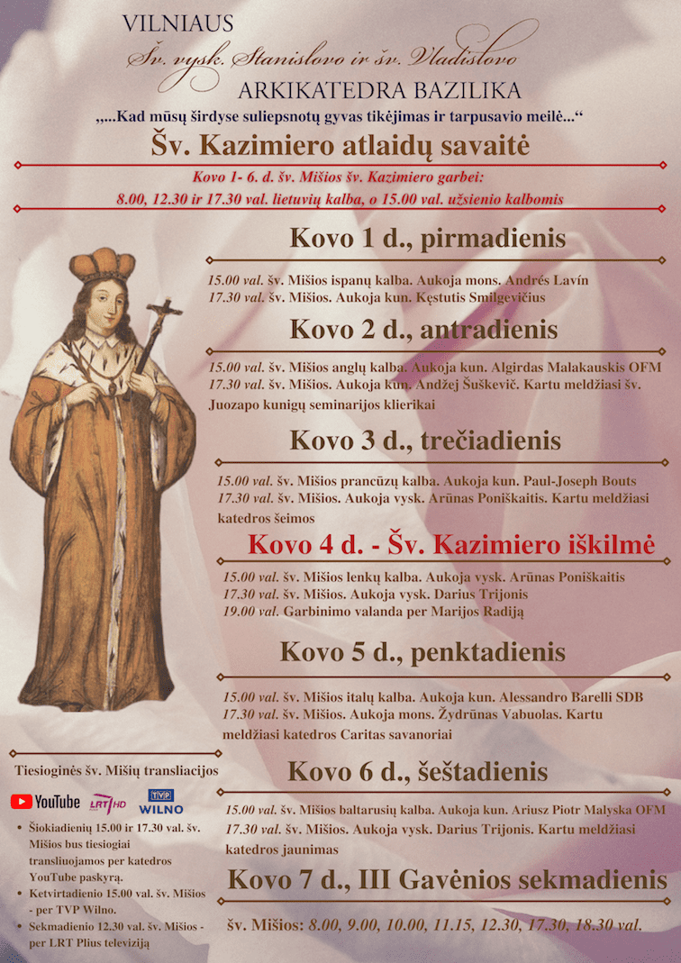 Kovo 4 d. minime šv. Kazimiero, pirmojo Lietuvos globėjo, iškilmę. Vilniaus Šv. vysk. Stanislovo ir šv. Vladislovo arkikatedros bazilikos bendruomenė kviečia kartu švęsti šio Lietuvos globėjo iškilmę.