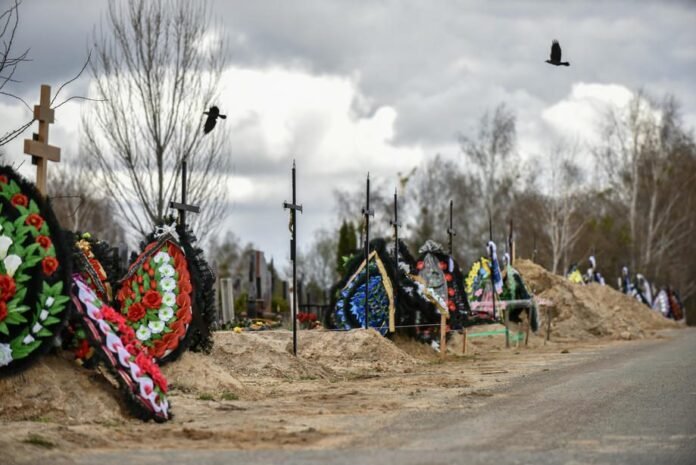 Per karo veiksmus Ukrainoje sugriauta daug civilių pastatų, iš rusų atkovotose teritorijose ukrainiečiai pranešė aptikę masines nužudytų civilių žmonių kapavietes, dalis jų buvo kankinti.