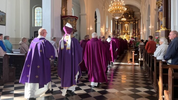 Po šv. Mišių dvasininkai ir visi susirinkusieji meldėsi Viešpaties Angelo maldą Šv. arkangelo Mykolo bazilikos šventoriuje, prie vysk. Juozo Žemaičio kapo.