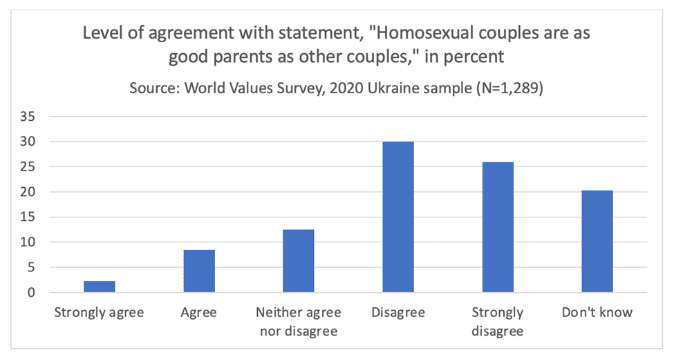 Panagrinėję paskutinę Pasaulio vertybių apklausą – gerai vertinamą tarptautinės apklausos projektą, pasižymintį išvystyta metodika, tinkamomis imtimis ir vienodais klausimynais visoms šalims, – greitai galime sužinoti šį bei tą apie Ukrainos gyventojus. Paskutinė apklausa Ukrainoje buvo atlikta 2020-aisiais – neseniai, bet prieš 2022 m. vasarį prasidėjusį karą. Duomenys atskleidžia, kad dauguma ukrainiečių neigiamai vertina homoseksualumą ir tos pačios lyties asmenų santuokas – taip neigiamai, kaip tai jau dešimtmečius nematyta Jungtinėse Valstijose.