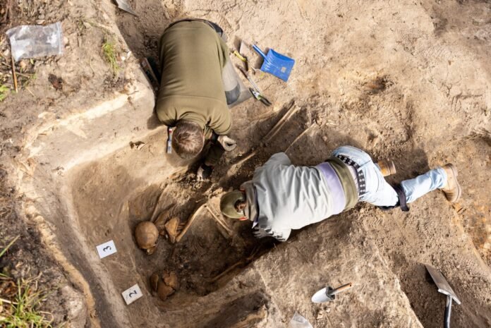 Kultūros vertybių globos tarnybos archeologų, vadovaujamų archeologo, Lino Kvizikevičiaus, atkasti palaikai rasti negiliai, keturiasdešimt centimetrų po velėna. Vienų palaikų rasti tik fragmentai, kiek giliau aptikti dar dviejų žmonių palaikai. Visi jie buvo sumesti kniūpsti.