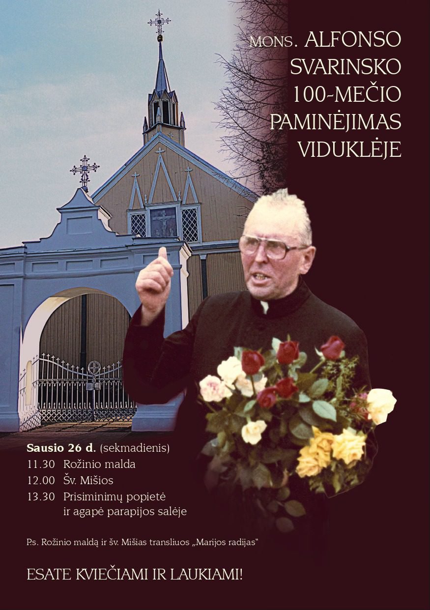Sausio 26 d. (sekmadienis) vyks mons. Alfonso Svarinsko 100-mečio minėjimas Viduklėje.