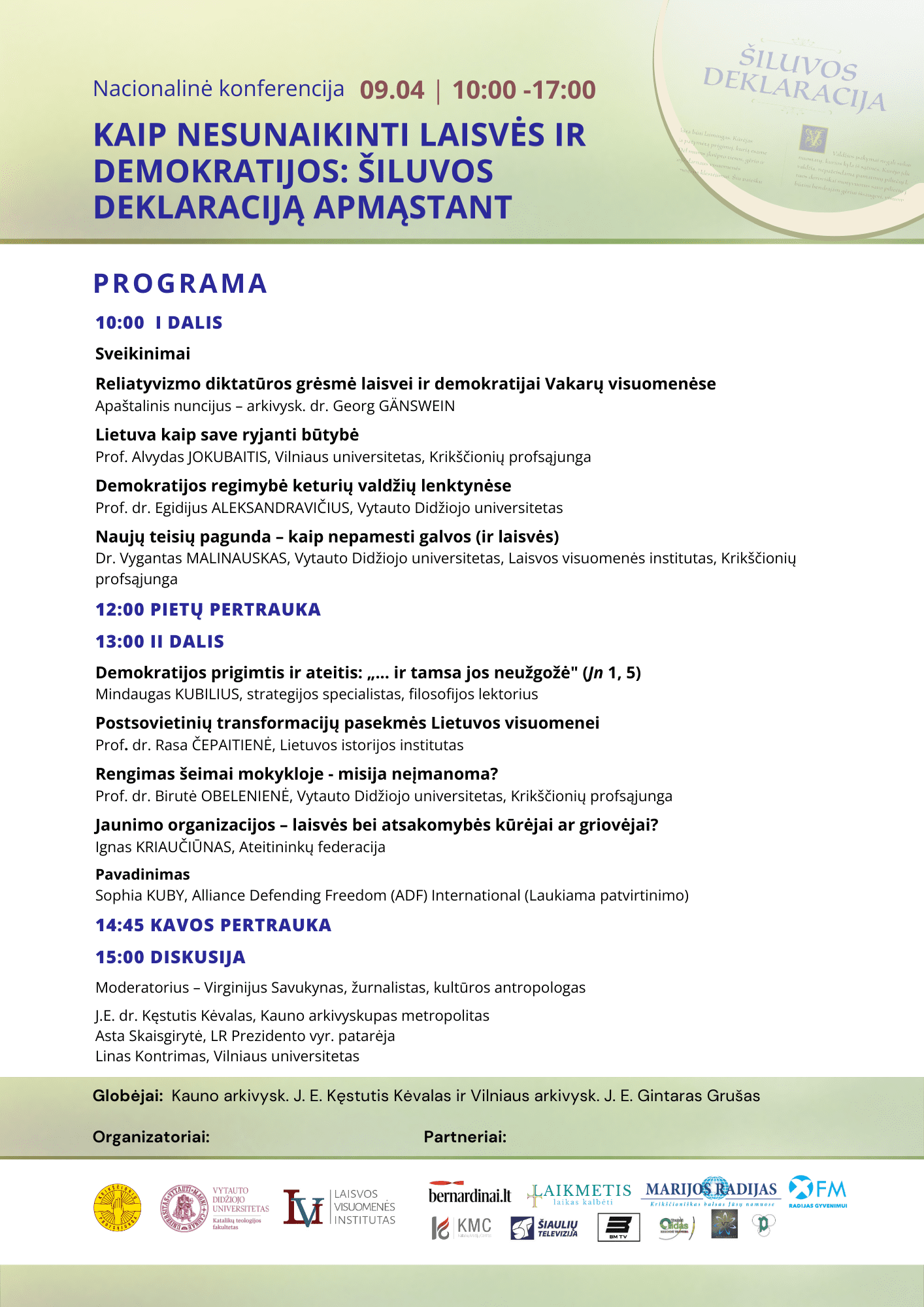 Konferencija skirta apmąstyti 2021 m. rugsėjo 12 d. paskelbtą Šiluvos deklaraciją, kurioje išskirtinai pabrėžta būtinybė laisvoje demokratinėje valstybėje gerbti pamatinį asmens ir visuomenės gėrį –žmogaus gyvybę nuo jo prasidėjimo iki natūralios mirties, vyro ir moters prigimtinį skirtingumą bei lygiavertiškumą, prigimtinę šeimą ir tėvų teisę pagal savo dorovinius principus auklėti savo vaikus, sąžinės, religijos ir žodžio laisvę.