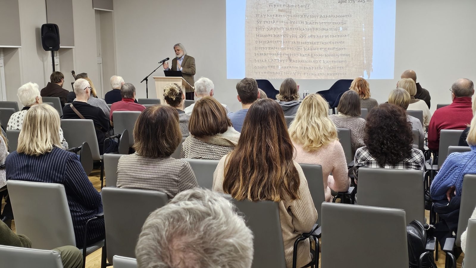 Jis pristatė neseniai 4 atskiromis knygomis Lietuvos Biblijos draugijos išleistą Naująjį Testamentą, papasakojo apie seniausius rankraščius ir koks buvo Šventojo Rašto kelias į Lietuvą.