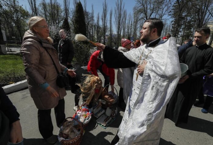 Kijevo Šv. Volodymyro katedrą apgulė šimtai tikinčiųjų su velykiniais krepšiais, kuriuos reikėjo palaiminti. Viduje viena moteris laikė suspaudusi kario ranką ir pasisukusi pabučiavo jam alkūnę. Kiti kariai meldėsi laikydami rankose žvakes, paskui persižegnojo. Pagyvenusi moteris lėtai skynėsi kelią pro minią ir stovus su mirgančiomis žvakėmis. Viena jauna moteris laikė narcizų puokštelę.