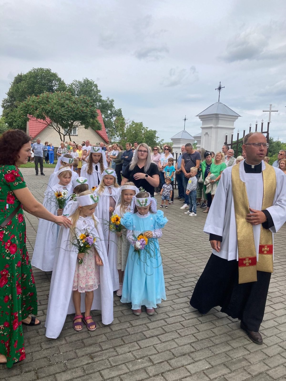 Aš dar pridedu maldos rožę ir siunčiu ilgametei parapijos tikybos mokytojai Onai Alesiūtei-Bleizgienei, kurios paruoštos mergaitės adorantės beveik 20 m. procesijoje barstė gėles. Dėl ligos ji negali lankyti bažnytėlės. Galima pasidžiaugti, kad tradicija tęsiasi jau su kita jauna parapijiete.