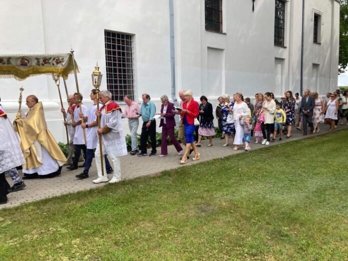 Tradiciškai pirmiausia vyko Eucharistijos procesija aplink bažnyčią.