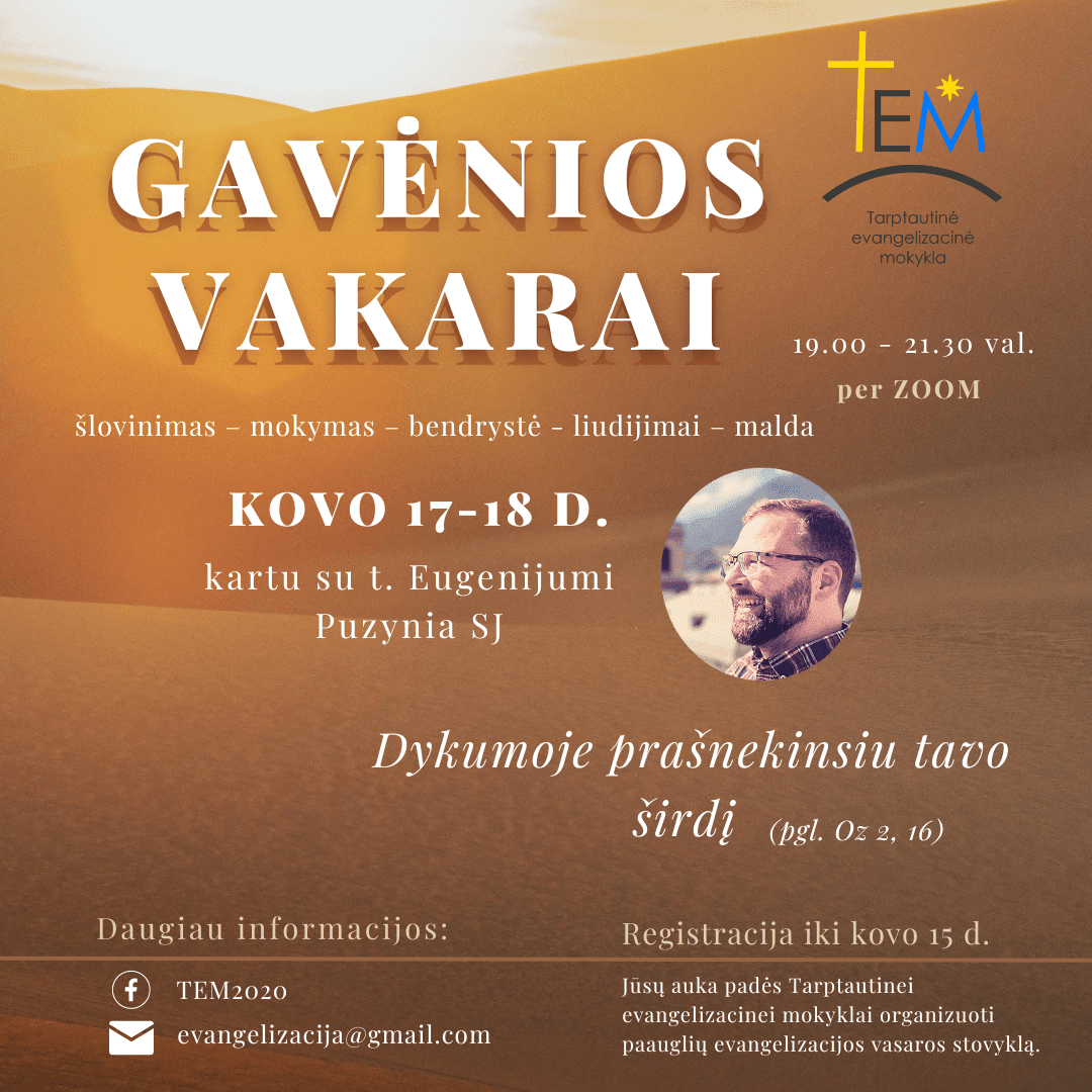 Tarptautinės evangelizacinės mokyklos jaunimas kartu su t. Eugenijumi Puzynia SJ, kovo 17-18 d., kviečia į gavėnios vakarus Dykumoje prašnekinsiu tavo širdį” (pgl. Oz 2, 16).