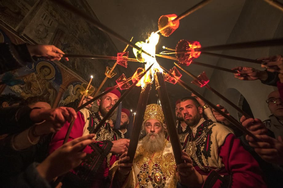 Išvakarėse Šventojo kapo bažnyčioje Jeruzalėje įvyko tradicinė Šventosios ugnies nužengimo apeiga, kuri laikoma stebuklinga. Jos metu Jeruzalės patriarchas Teofilius III, apsivilkęs tik albą, su neuždegtomis žvakėmis rankose ir be jokių priemonių, kurios galėtų sukelti įtarimų dėl žemiškos Šventosios ugnies kilmės, įžengia į koplyčią ir meldžiasi.