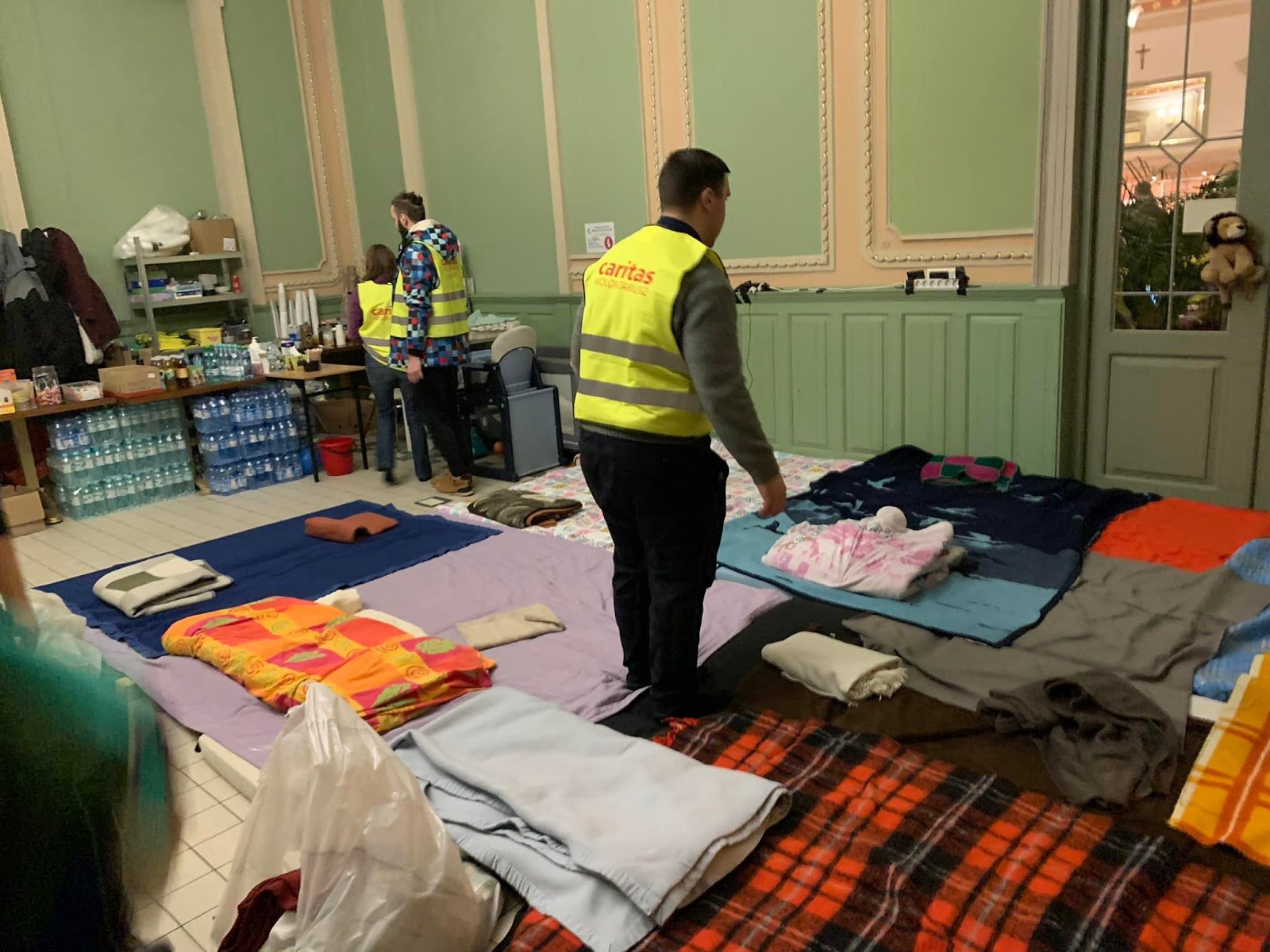 Atsiliepdami į skelbimus socialiniuose tinkluose, pasiūlėme savo pagalbą Lenkijos Autokefalinės Ortodoksų Bažnyčios gailestingumo darbų organizacijai „Eleos“. Jie mus nukreipė į Lenkijos „Caritą“, nes patys Lenkijos ortodoksai vykdo savo veiklą per katalikų „Caritą“, kuris, mano įspūdžiu, čia, pasienyje, ir vykdo didžiausią veiklą. Štai ir dabar, žiūriu aplink ir matau daugiausiai „Carito“ palapinių, pastatų.