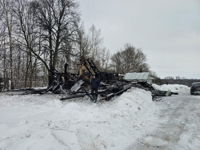 Klebono G. Numgaudžio žodžiais, pastate tuo metu glaudėsi trys žmonės, jie bandė atšildyti užšalusį vamzdį, prie jo paliko įjungtą šildytuvą-„vėjelį“ ir išėjo pietauti. Pastebėjus gaisrą, buvo iškviesti ugniagesiai. Šiems atvykus, medinis vieno aukšto su mansarda pastatas jau degė atvira liepsna. Per gaisrą nudegė ir sukrito stogas, išdegė medinis perdengimas, sienos ir viduje buvę daiktai.