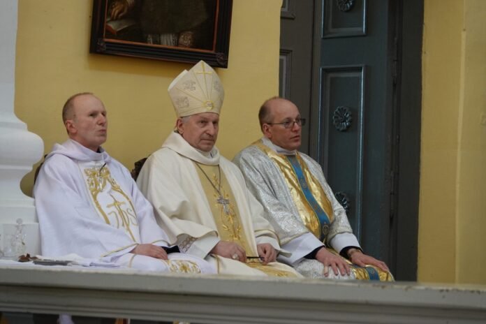Prieš sumą, skambant choro giesmei, iškilmingai atlydėtas garbus parapijos svečias Vilkaviškio vyskupas Rimantas Norvila.