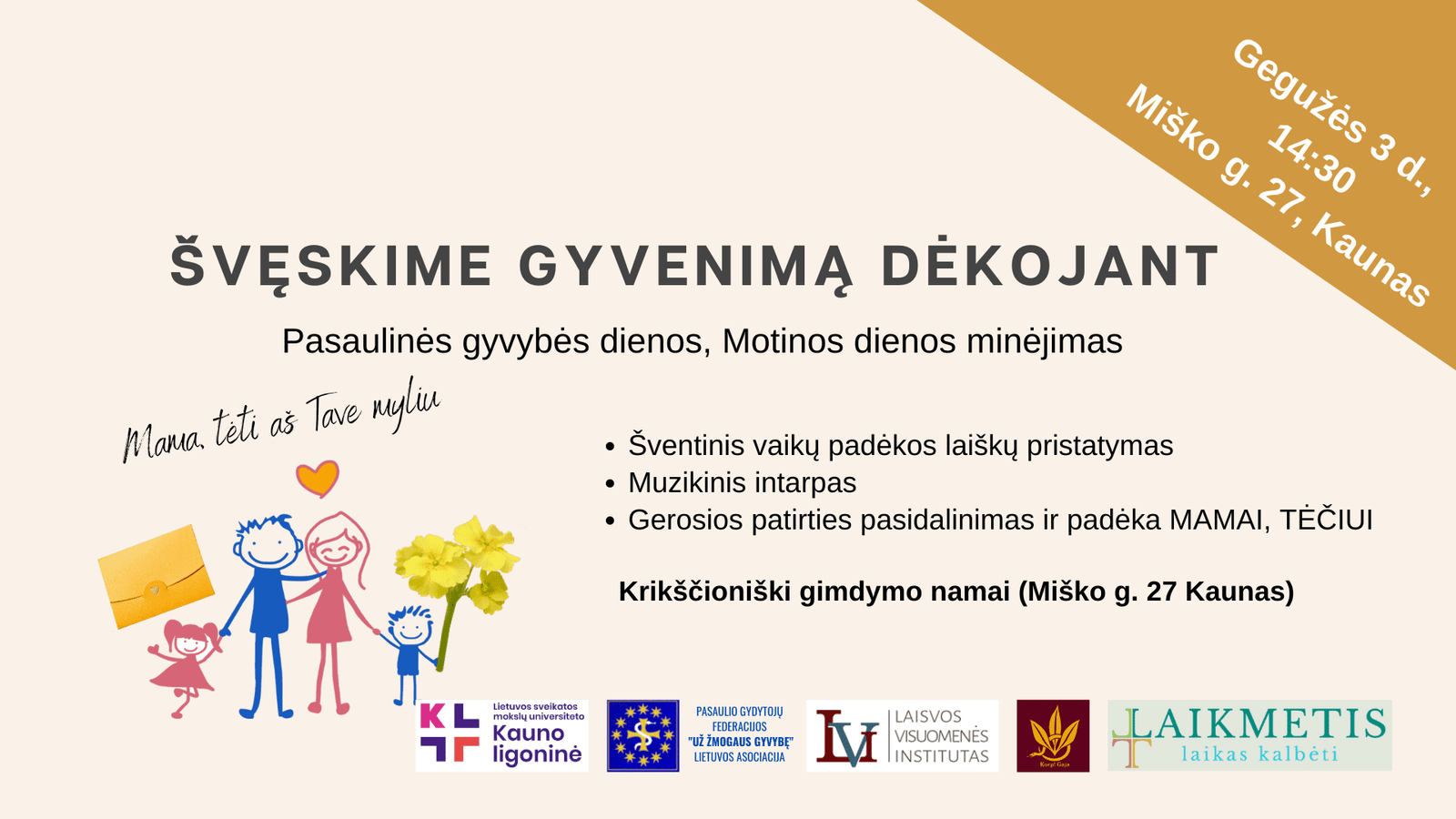 - Šventinis padėkos laiškų Mamai pristatymas su trumpa menine programa vyks gegužės 3 d. 14.30 val. Krikščioniškųjų gimdymo namų kiemelyje (Miško g. 27, Kaunas).