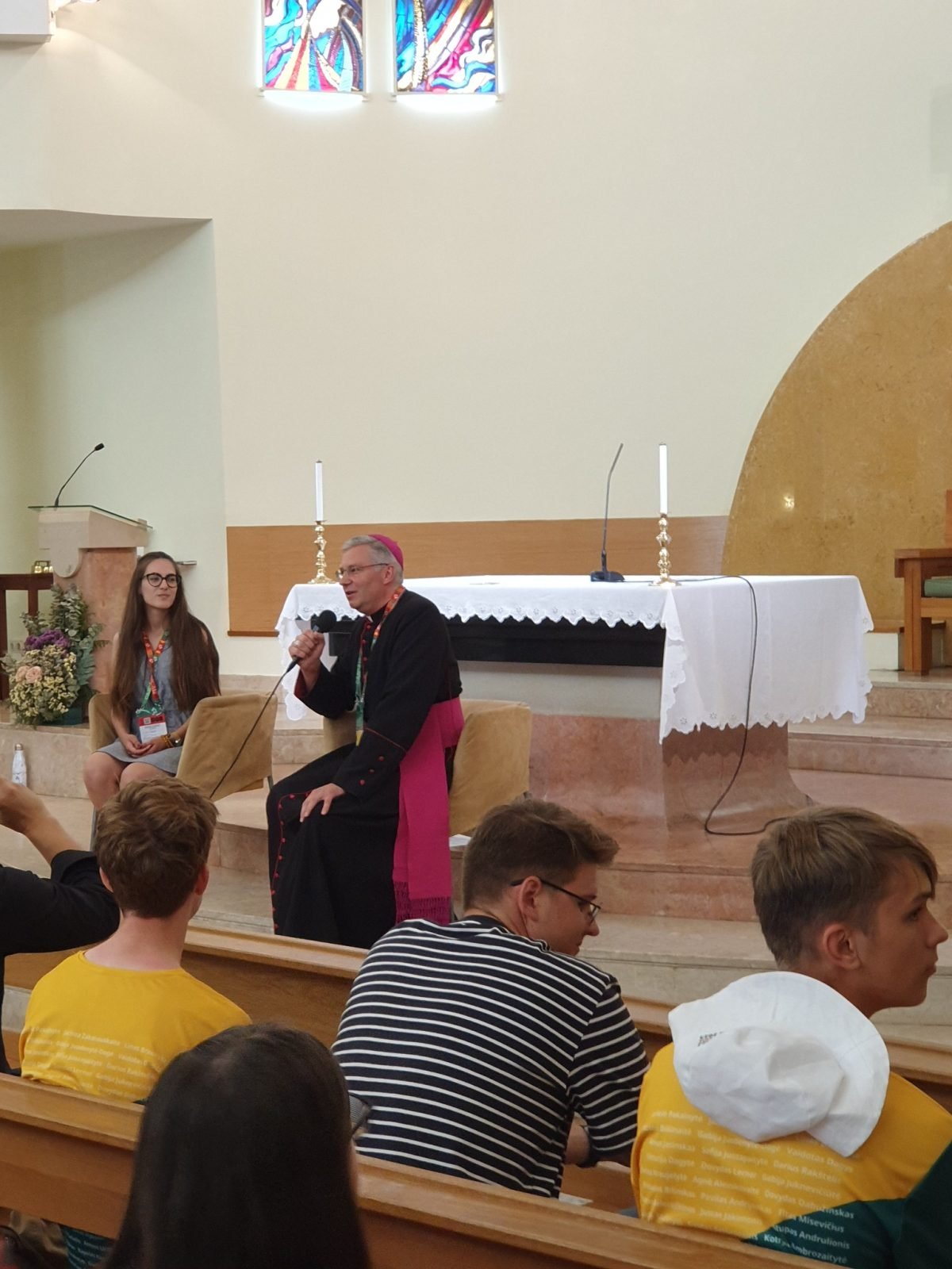Jaunimas jaučia poreikį pažinti savo ganytojus, todėl renginio vedėjai pasisodino Kauno arkivyskupą Kęstutį Kėvalą ir uždavė jam visą eilę klausimų apie pašaukimą, apie vyskupo mintis ir prašė prisiminti juokingiausią istoriją. Ganytojas ją ir papasakojo.