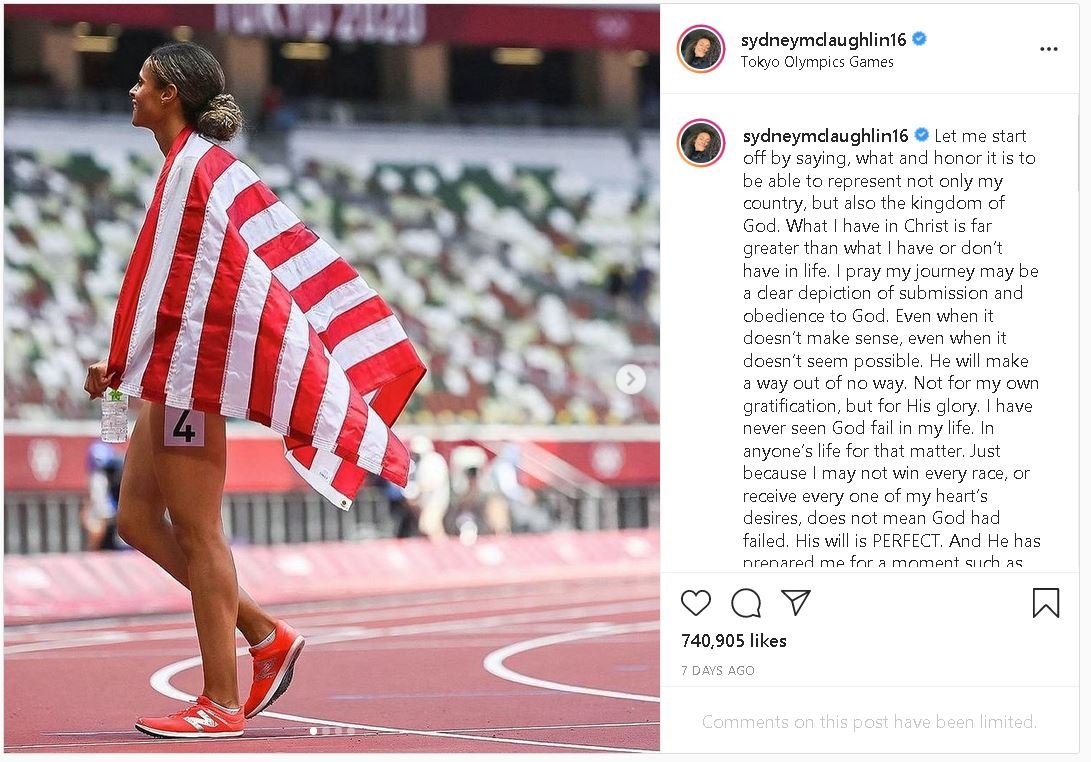 „Takelių žvaigždė“ Sydney McLaughlin tylėjo socialiniuose tinkluose per šias Tokijo olimpines žaidynes. Tačiau praėjusią savaitę ji nutraukė šią tylą ilgu „Instagram“ įrašu, šlovinančiu Dievą.
