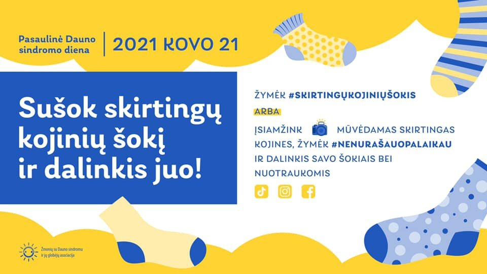 Prašome mūvėti skirtingas kojines kovo 21 dieną ir paskatinti tai daryti kitus! Siūlome bent dieną pakvailioti, nebijoti pabūti kitokiais ir padėti skleisti žinią.