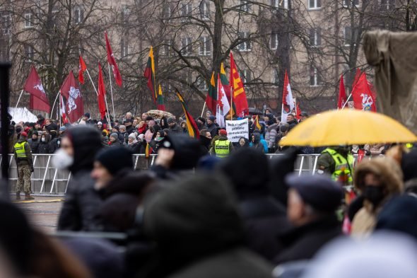 Pasibaigus Laisvės gynėjų dienos minėjimui, protestuotojai tęsia mitingą „prieš privalomą testavimą darbuotojų lėšomis, galimybių pasą“, taip pat protestuotojai reikalauja atstatydinti Vyriausybę.