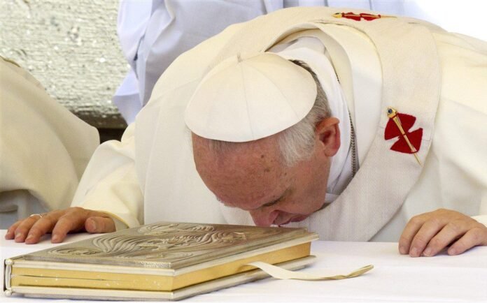 „Meldžiu Šventosios Dvasios visada vesti ir remti jūsų tarnystę“, – sakė popiežius. Šventosios Dvasios veikimu tie, kurie susiduria su Šventuoju Raštu, per Kristų pradeda atskleisti Dievo gelmę ir įtiki.