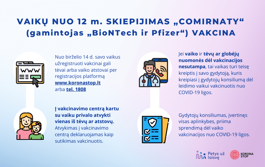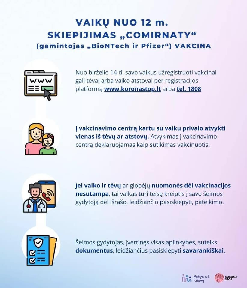 „Europos vaistų agentūrai leidus „Comirnaty“ vakcina nuo koronaviruso skiepyti 12–15 metų asmenis, šios amžiaus grupės vakcinacija startuoja ir Lietuvoje. Nuo pirmadienio registruoti vaikus skiepijimui gali tėvai (įtėviai), globėjai arba rūpintojai”, – rašoma Vyriausybės feisbuko paskyroje.