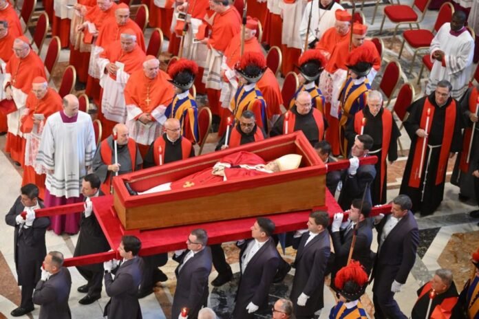 Popiežiaus Pranciškaus karstas po procesijos perkeltas į Šv. Petro baziliką, lydint dešimtims kardinolu ir šveicarų gvardiečiams.