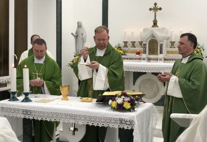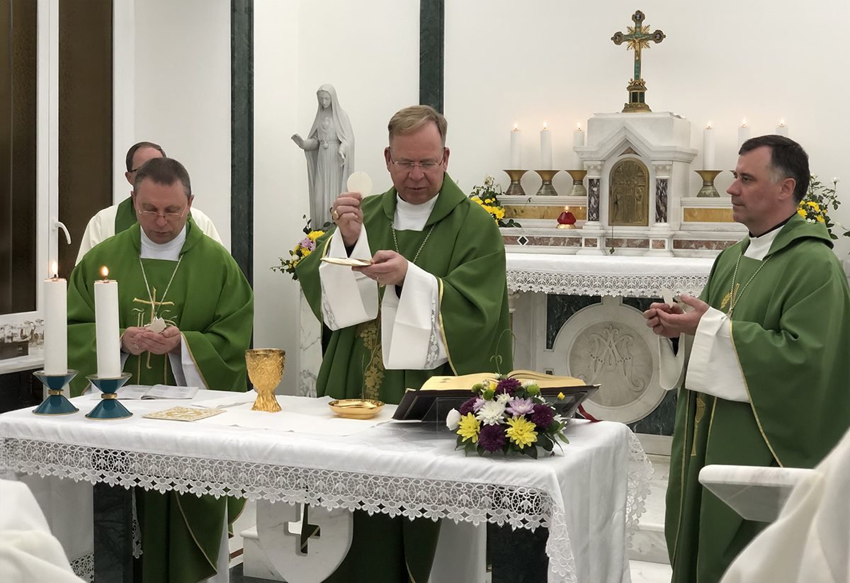 Šv. Mišioms italų kalba vadovavo arkivyskupas Gintaras Grušas, koncelebravo arkivyskupas Rolandas Makrickas, vysk. Algirdas Jurevičius, kolegijos rektorius kunigas Audrius Arkštikaitis, marijonų genenalinis vyresnysis t. Josephas Roeschas MIC, kolegijoje gyvenantys bei į svečius atvykę kunigai.