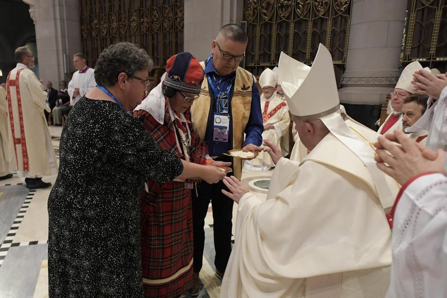 „Dėl šios priežasties išreiškiu savo gėdą bei gilų liūdesį ir kartu su šios šalies vyskupais dar kartą prašau atleidimo už krikščionių padarytą skriaudą čiabuvių tautoms, – sakė Pranciškus. – Šventasis Sostas ir vietinės katalikų bendruomenės įsipareigoja skatinti čiabuvių kultūrą konkrečiomis dvasinio palydėjimo formomis, apimančiomis dėmesį jų kultūrinėms tradicijoms, papročiams, kalboms, laikantis Jungtinių Tautų deklaracijos dėl čiabuvių tautų teisių. Trokštame atnaujinti Bažnyčios ir Kanados čiabuvių tautų santykius, kuriuose buvo daug meilės, davusios puikių vaisių, tačiau ir tragiškų gilių žaizdų, kurias esame pasiryžę suprasti ir išgydyti.“