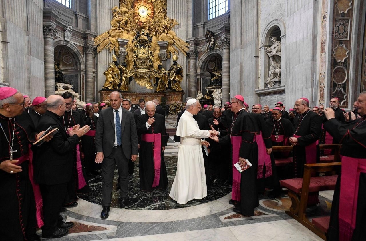„Kiekvienas iš jūsų, kaip ir aš, pirmiau nei ganytojas, yra Viešpaties kaimenės avis! Tad mes pirmieji esame pakviesti žengti pro Šventąsias duris, Kristaus Išganytojo simbolį. Kad galėtume vadovauti mūsų globai patikėtai Bažnyčiai, turime leisti jam, Gerajam Ganytojui, mus giliai atnaujinti, kad visiškai atitiktume jo širdį ir jo meilės slėpinį“, – sakė popiežius vyskupams.