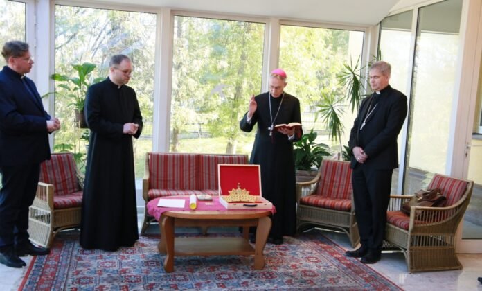 Čia vyskupui Linui OFM įteiktas Kulto dikasterijos dekretas, kuriuo patvirtinama, kad Popiežius laimina Krekenavos Švč. M. Marijos – Materspei – Motinos Vilties – karūnas, pagamintas iš tikinčiųjų paaukoto aukso.
