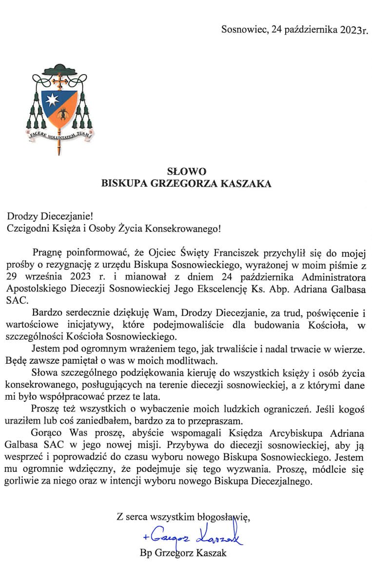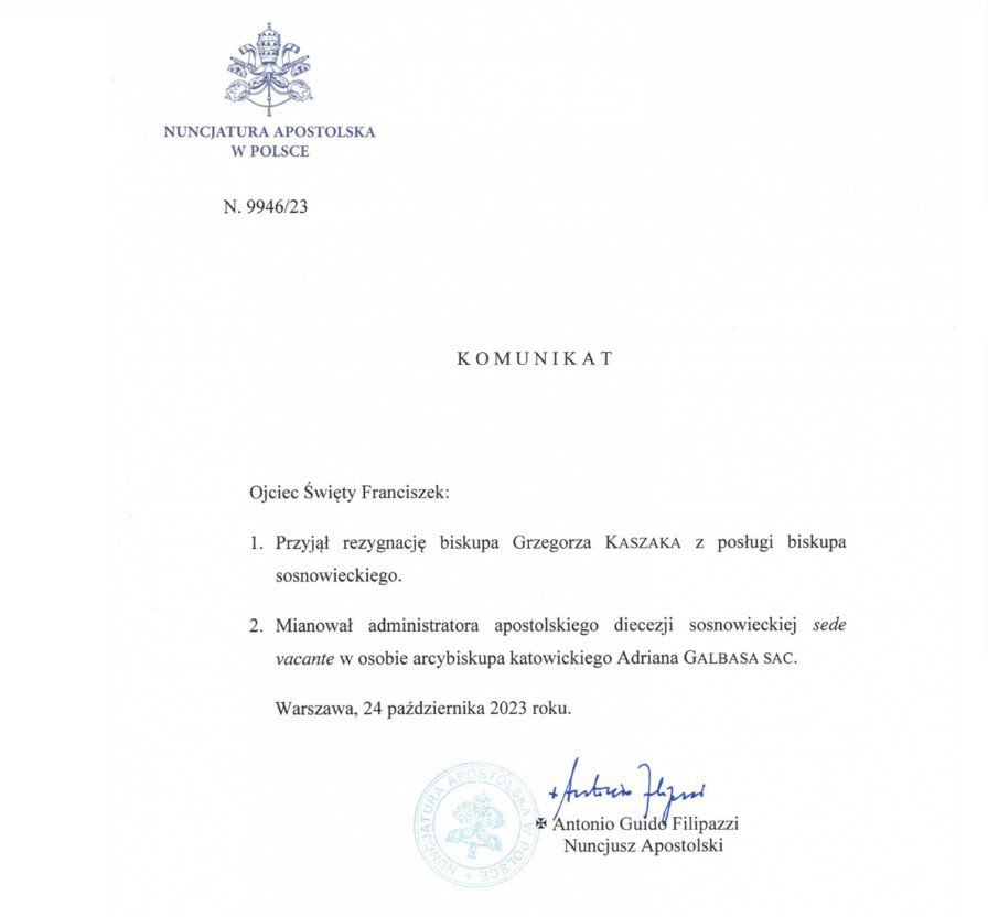 Spalio 24 d. pareiškime Šventojo Sosto nunciatūra Lenkijoje nenurodė priežasčių, dėl kurių atsistatydino Sosnoveco vyskupas Grzegorzas Kaszakas (Gžegožas Kašiakas).