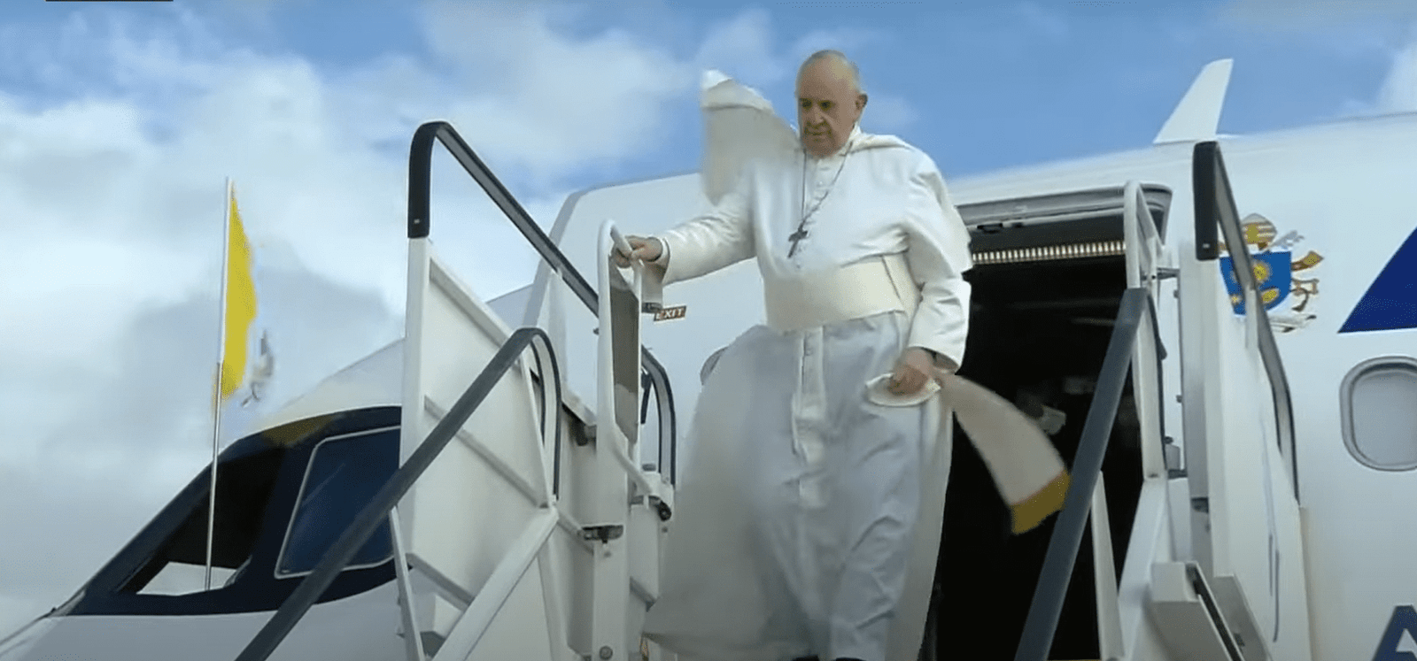 Oro uoste pūtė labai žvarbus vėjas, jo sutana plaikstėsi aplink kojas. Pellegrina (trumpa pelerina ant pečių) kartais plaikstėsi jam į veidą ir užstojo vaizdą. Lipdamas laiptais jis sustojo, kad nusiimtų ją nuo veido, ir vos nepargriuvo. Padėjėjas greitai užlipo laiptais, kad prilaikytų peleriną, kai Šventasis Tėvas žengė paskutinius kelis žingsnius ir atsisukęs paskutinį kartą pamojavo susirinkusiems jį išlydėti.