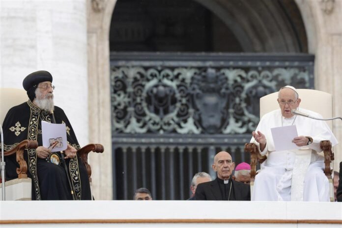 „Broliai ir seserys! Su dideliu džiaugsmu šiandien sveikinu jo šventenybę Tavadrosą II, Aleksandrijos popiežių ir Šv. Morkaus sosto patriarchą, ir jį lydinčią garbingą delegaciją. Jo šventenybė Tavadrosas priėmė mano kvietimą atvykti į Romą ir su manimi švęsti istorinę penkiasdešimties metų popiežiaus šv. Pauliaus VI ir popiežiaus Šenūdos III susitikimo 1973 metais sukaktį“, – sakė popiežius Pranciškus, priminęs, kad tai buvo pirmasis Romos vyskupo ir Koptų Ortodoksų Bažnyčios patriarcho susitikimas istorijoje, kurio metu, taip pat gegužės 10-ąją, pasirašyta įsimintina bendra kristologinė deklaracija.