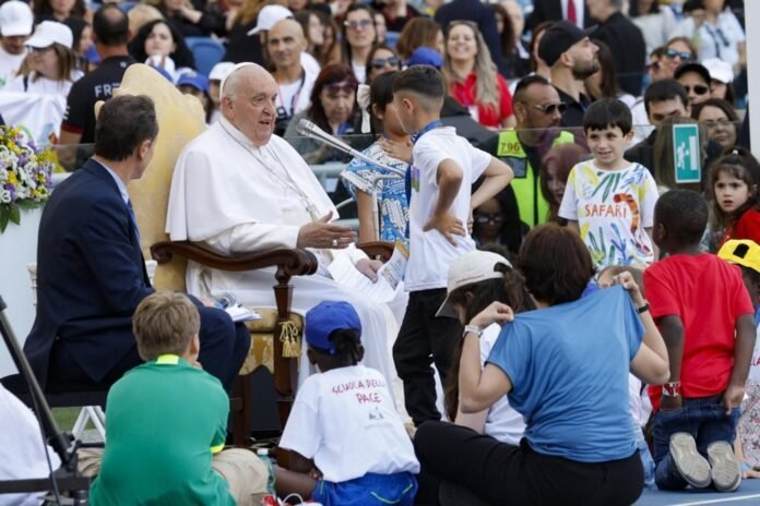 „Brangūs berniukai, brangios mergaitės, mes čia susirinkome melstis, melstis kartu, melstis Dievui, – sakė Pranciškus. – Mes meldžiamės Dievui Tėvui, Dievui Sūnui ir Dievui Šventajai Dvasiai. Kiek yra dievų? Vienas trijuose asmenyse. Tai Tėvas, kuris mus visus sukūrė, kuris mus labai myli. Tai Dievas, į kurį kreipiamės „Tėve mūsų“ malda. Šia malda mes jo prašome, kad jis lydėtų mus gyvenime ir padėtų mums augti.