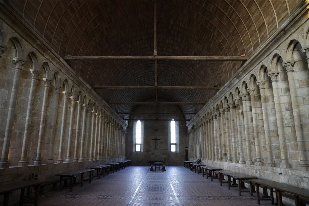 „Tai buvo laikas, kai Prancūziją dengė baltas bažnyčių apsiaustas, kaip kartą rašė vienuolis iš Cluny. Reikia įsivaizduoti milžinišką šio darbo mastą. Granito blokai buvo išpjauti Chausey salose, už 34 kilometrų nuo čia. Buvo naudojamas Kano akmuo, minkštas, lengvas akmuo, kurį lengva raižyti. … Kai per Šimtametį karą romaninis ansamblis sugriuvo, jis buvo atstatytas puošniu gotikos stiliumi.”