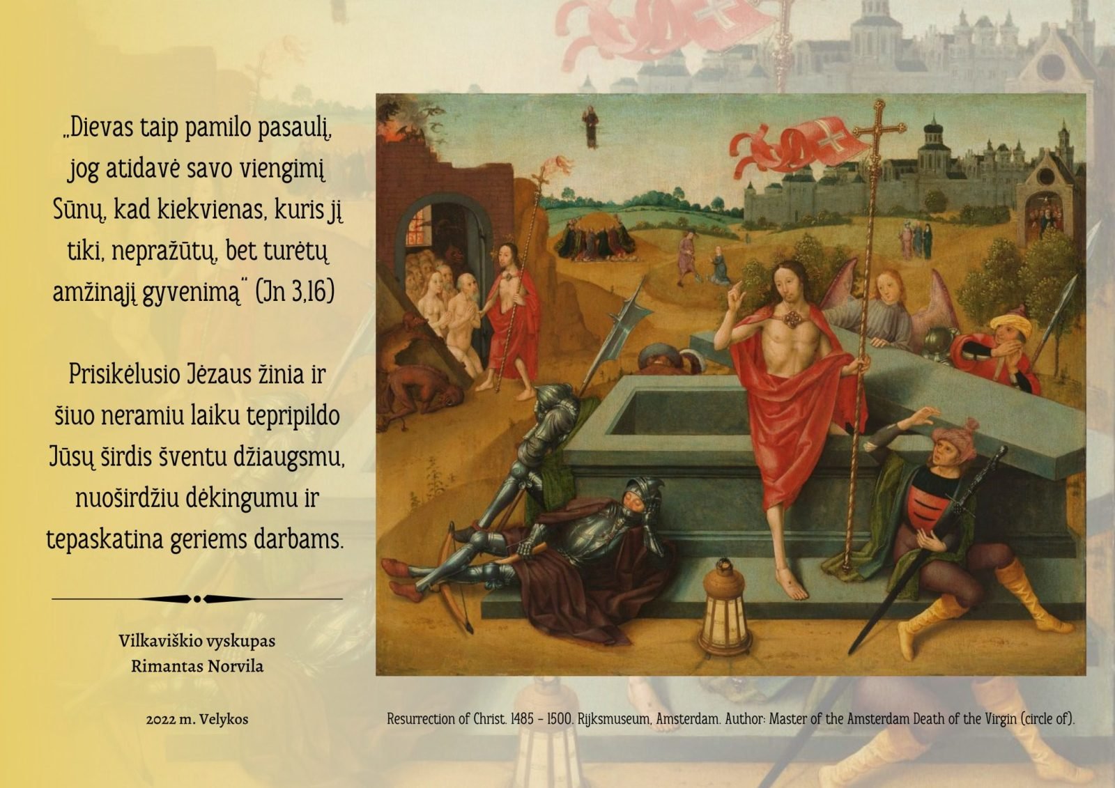 Tegul šiemet Velykų laiku Dievo ir artimo meilė dar gausiau reiškiasi per mūsų mintis, žodžius ir darbus, tepalaimina ir tepapildo mūsų džiaugsmą per šventines tradicijas, bendravimą prie stalo, gardžius valgius ir margučius. Tegul bus daugiau vilties žvelgiant į dabarties tikrovę ir siekiant amžinojo džiaugsmo tikrovės!