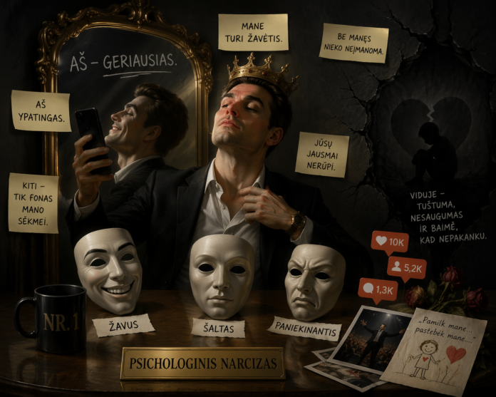 Jis visu tuo pamaitina savo vidinę tuštumą ir giliai tūnantį niekingumo ir bevertiškumo jausmą bei pavydą, kruopščiai slepiamus po pabrėžtinu savo vertės ir išskirtinumo demonstravimu (pavyzdžiui, ne vienas mano sutiktas narcizas teigė esąs aristokratiškos kilmės, turįs išskirtinių talentų ir gebėjimų, kurie dažniausiai niekaip išoriškai nepasireikšdavo), net paslaptingai užsimindavo esąs persekiojamas spec. tarnybų (čia jau narcisizmas persipina su paranoja, nes jeigu man, tokiam nuostabiam ir nepakartojamam, kas nors nesiseka, tai dėl to juk bus kaltas kas nors kitas, galingesnis – negi kitaip?) ir t.t.).