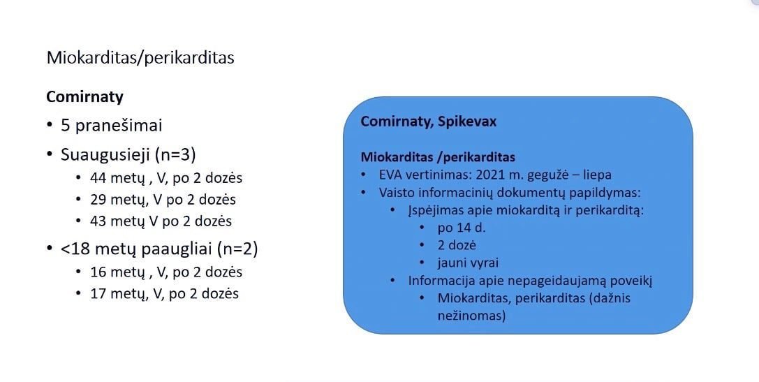 Pavyzdys: viena iš Comirnaty vakcinos nepageidaujamų reakcijų yra miokarditas/perikarditas. Europos vaistų agentūra šios komplikacijos įvertinimą atliko 2021 m. gegužės – liepos mėnesiais, vakcinacijos procesui jau įsibėgėjus. Buvo rekomenduota papildyti vaistinio preparato informacinį lapelį įspėjimu apie miokarditą/perikarditą, pasireiškiantį jauniems vyrams po antrosios vakcinos dozės praėjus 14 dienų, nurodant, kad jo dažnis kol kas nežinomas (!).