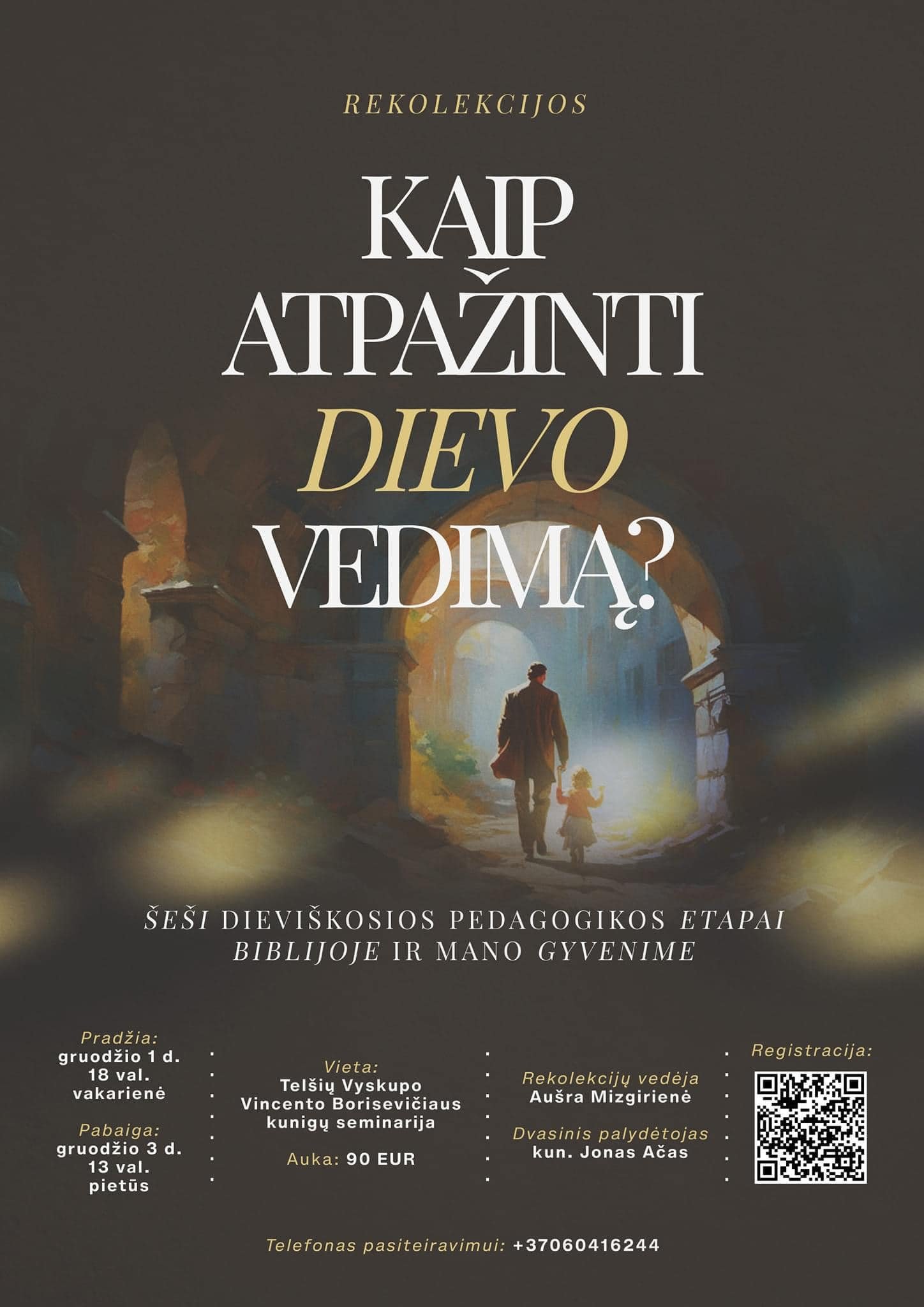 Tikintieji gruodžio 1 – 3 d. kviečiami į rekolekcijas „Kaip atpažinti Dievo vedimą” su Aušra Mizgiriene ir Jonu Aču. Jos vyks Telšių kunigų seminarijoje.