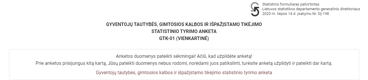 Lietuvos statistikos departamentas pirmą kartą atlieka Gyventojų tautybės, gimtosios kalbos ir išpažįstamo tikėjimo statistinis tyrimą. Vasario 28 d. baigiasi pirmasis – internetinės apklausos – etapas. Gyventojai raginami prisijungti adresu https://surasymas.stat.gov.lt ir atsakyti į keturis klausimus: kokia jų tautybė, gimtoji kalba, kokių dar kalbų moka, kokį tikėjimą išpažįsta.