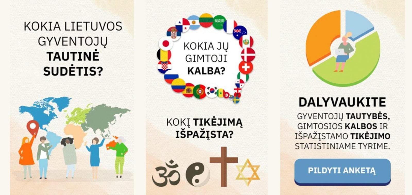 Lietuvos statistikos departamentas pirmą kartą atlieka Gyventojų tautybės, gimtosios kalbos ir išpažįstamo tikėjimo statistinis tyrimą. Vasario 28 d. baigiasi pirmasis – internetinės apklausos – etapas. Gyventojai raginami prisijungti adresu https://surasymas.stat.gov.lt ir atsakyti į keturis klausimus: kokia jų tautybė, gimtoji kalba, kokių dar kalbų moka, kokį tikėjimą išpažįsta.