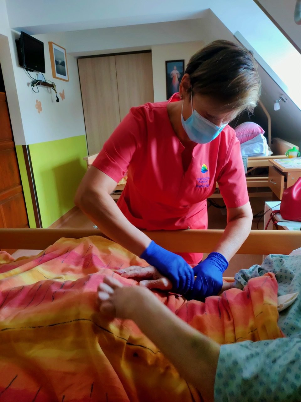 „Hospise yra tikrai jauku, gera, maloniai kvepia, – pasakoja moteris. – Patys ligoniai gal ir ne visada man gali kažką pasakyti, tačiau žinau, kad jie viską jaučia. Duodi jiems ranką, jie ją glosto, paspaudžia… Taip ir susikalbame…“