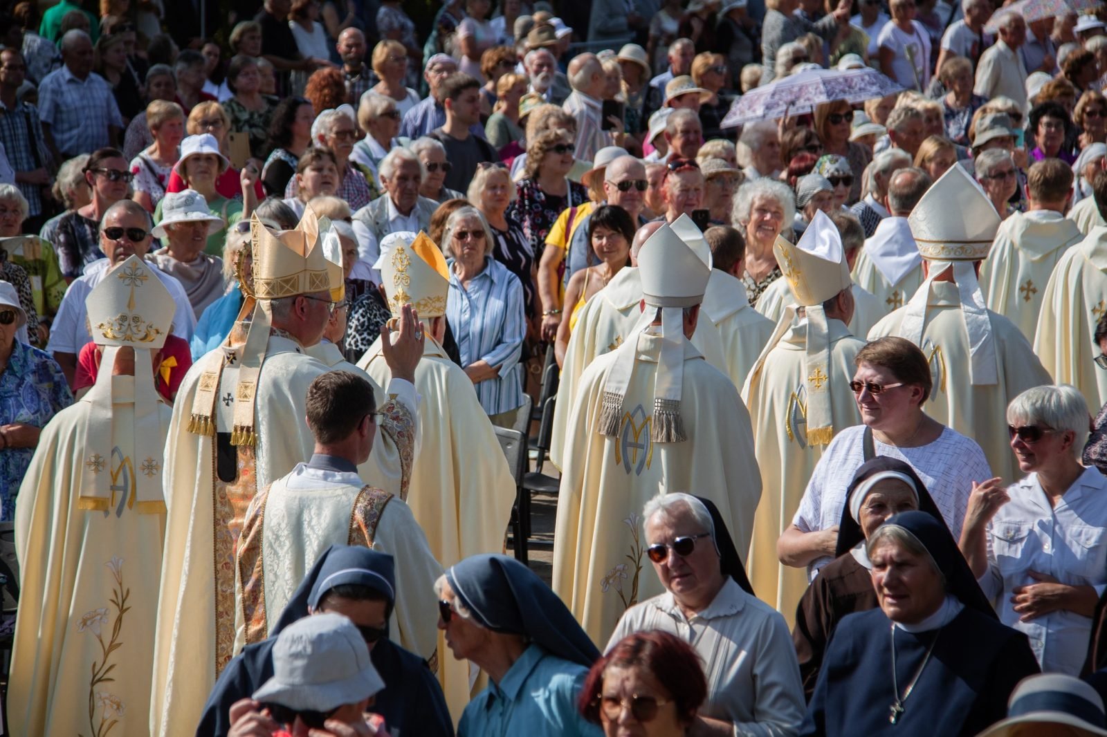 Arkivyskupas sveikino pašvęstųjų seserų šeimą Lietuvoje – į Šiluvą melstis atvyko daugiau kaip 20 vienuolinių kongregacijų sesių, kurios tarnavo liturgijoje: giedojo jungtiniame chore drauge su seminaristais ir Garliavos bažnyčios choristais, skaitė skaitinius, dalyvavo su broliais atnašų procesijoje.