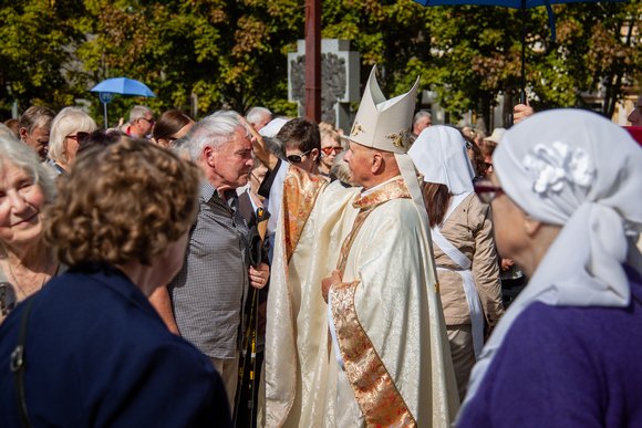 Šiuos piligrimus aikštėje pradėdamas iškilmingą Eucharistiją už ligonius bei jiems tarnaujančius medicinos, slaugos, socialinius darbuotojus pasveikino Kauno arkivyskupas Kęstutis Kėvalas.