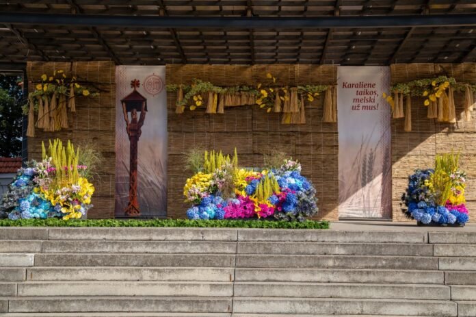 „Kasmet susiduriame su iššūkiu, kaip vis kitaip papuošti Šiluvą atlaidams, nes jau dvylika metų tuo užsiimame. Šiemet visa puošybos koncepcija išskirtinė savo ryškiomis spalvomis, naudojamos tik skintos gėlės, atsirado floristinių elementų ant lauko altoriaus sienos. Vienuolių skintus ir rištus ajerų skydus pagyvinome medžių šakomis, dekoruotomis rištomis rafijomis ir anturiais. Pučiant vėjui jie juda ir suteikia gyvybę visam dekorui“, – sako puošybos koncepcijos autorė, Karaliaus Mindaugo PMC floristikos profesijos mokytoja Evelina Grėbliauskė.