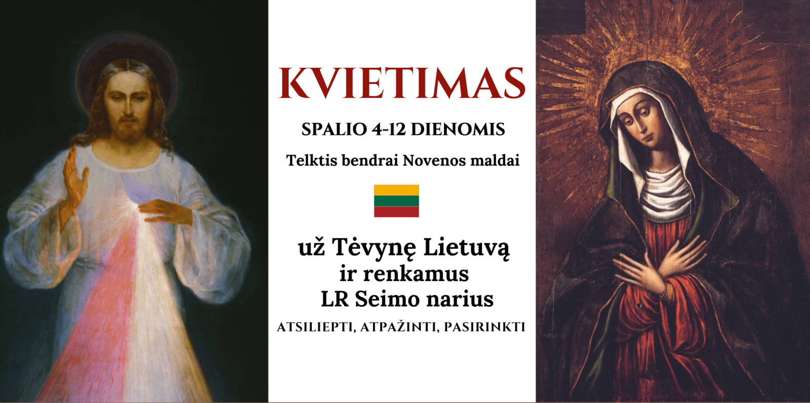 Maldos akcijos „Už Tėvynę Lietuva ir renkamą valdžią” iniciatyvinė grupė kviečia visus tikinčiuosius susitelkti maldoje ir nuo spalio 4 d. melstis noveną (devyndienį) į Švč. Jėzaus Širdį už Tėvynę Lietuvą ir renkamus LR Seimo narius.