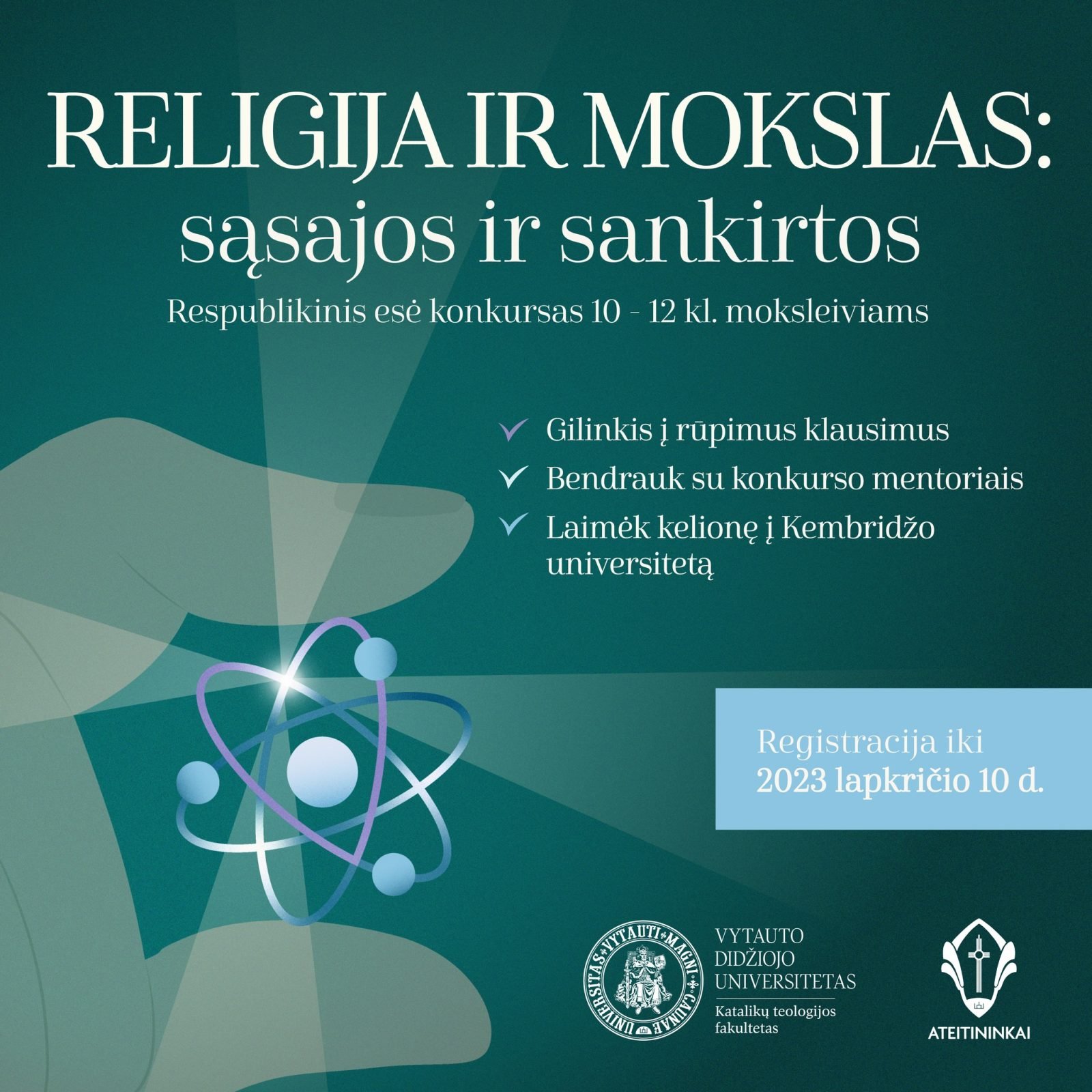 VDU Katalikų teologijos fakultetas drauge su Ateitininkų federacija organizuoja respublikinį moksleivių esė konkursą „Religija ir mokslas: sąsajos ir sankirtos”, praneša Kauno arkivyskupija.