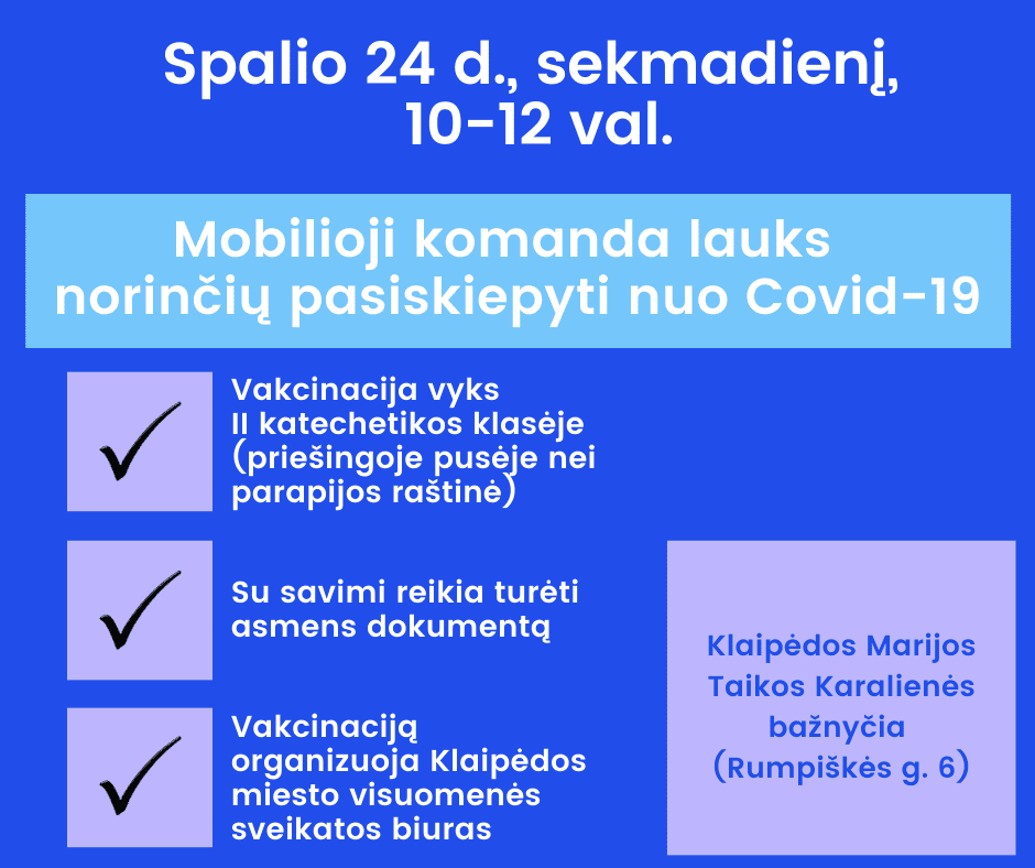 Šį sekmadienį, spalio 24 d., Klaipėdos mobili skiepų komanda atvyks į Marijos Taikos Karalienės bažnyčią.