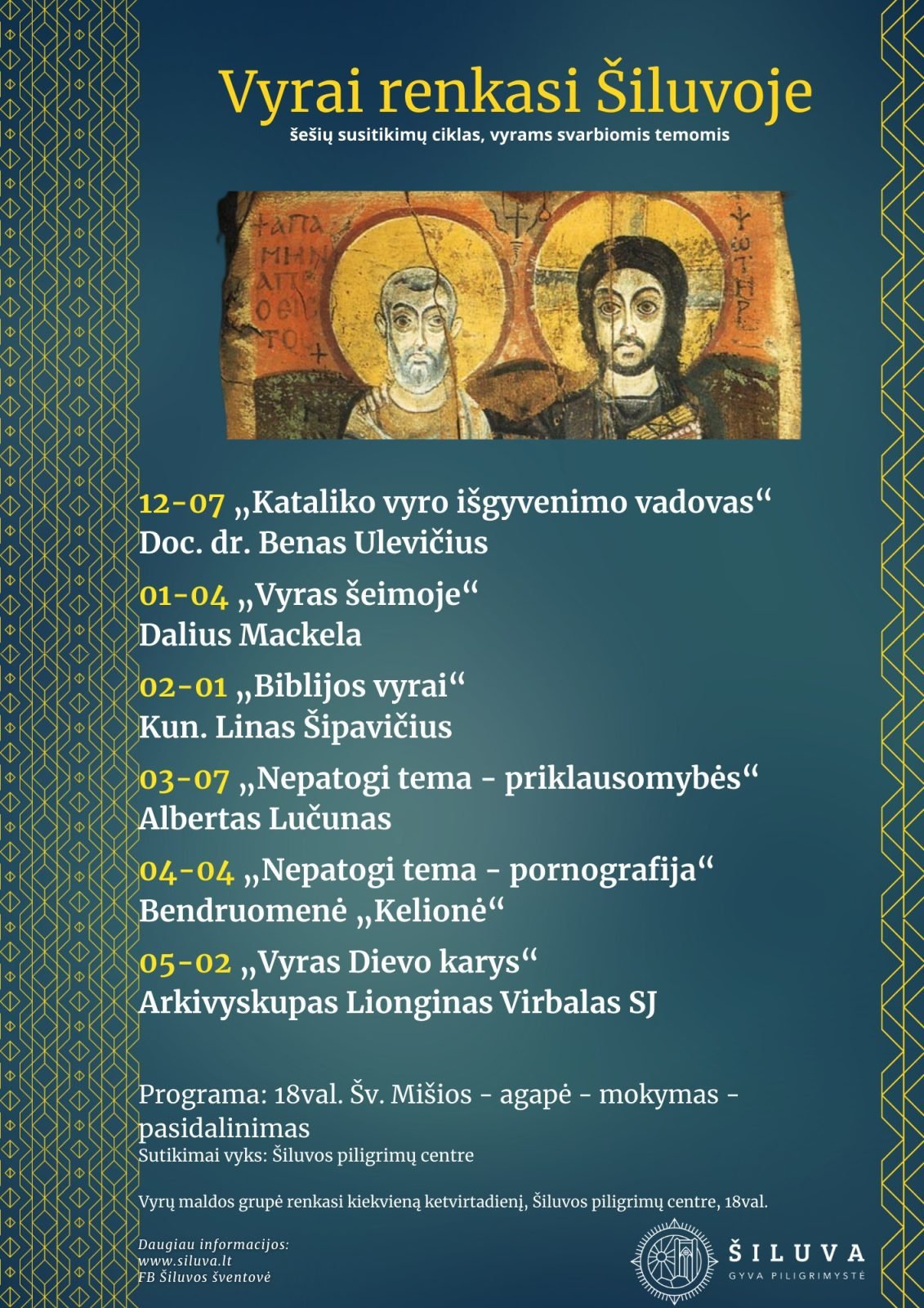 „Palaimintas vyras, kuris VIEŠPATIES pagarbiai bijo, kuris nuoširdžiai vykdo jo įsakymus.“ (plg. Ps 112,1), – Šiluvos Šventovė kviečia vyrus, trokštančius suprasti ir pažinti, ką reiškia būti Dievo vyru šiame pasaulyje, į bendrus vakarus, kuriuose kartu melsimės, mokysimės, dalinsimės ir išgyvensime vyriškumo dovaną.