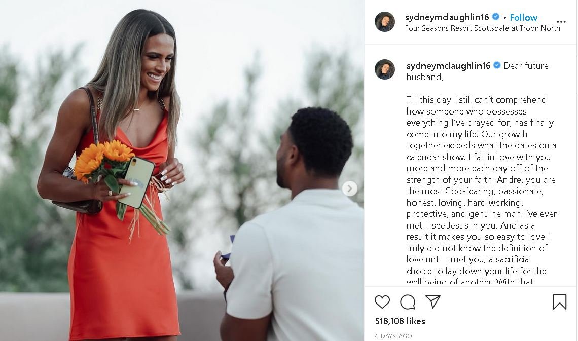 JAV olimpinio aukso medalio Tokijuje laimėtoja Sydney McLaughlin paskelbė apie sužadėtuves su buvusiu NFL žaidėju Andre Levronu Jaunesniuoju, kuris pažadėjo mylėti savo būsimą žmoną kaip „Kristus mylėjo Bažnyčią“.