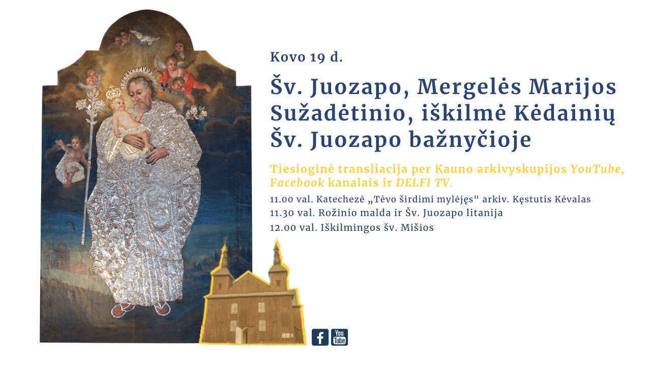 Kovo 19 d. Kėdainių Šv. Juozapo bažnyčioje, kuri yra ir piligriminė Kauno arkivyskupijos šventovė su maloninguoju XVIII a. Juozapo atvaizdu didžiajame altoriuje, 11 val. prasidės arkivyskupo Kęstučio Kėvalo katechezė „Tėvo širdimi mylėjęs“, 11.30 val. kalbamas Rožinis ir Šv. Juozapo litanija. 12 val. iškilmingos šv. Mišios. Vadovauja arkivyskupas metropolitas Kęstutis Kėvalas. Transliacija Kauno arkivyskupijos Youtube kanale, Facebook, DELFI.lt