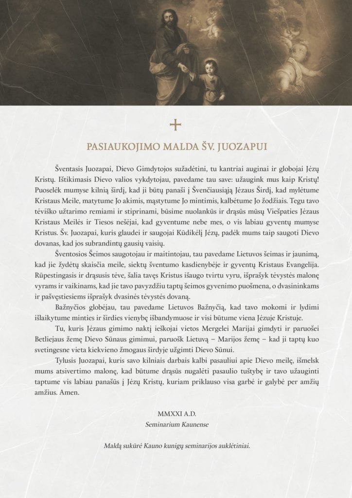 Kovo 19 d. 19 val. Kauno Švč. Trejybės (seminarijos) švenčiant Eucharistiją, Šv. Mišių dalyviai paves Lietuvą, Bažnyčią ir save pačius Šv. Juozapo globai. Transliacija Kauno kunigų seminarijos Facebook paskyroje arba Transliacija Kauno arkivyskupijos Youtube kanale. Pasiaukojimo Šv. Juozapui malda, kurią sukūrė Kauno kunigų seminarijos auklėtiniai: